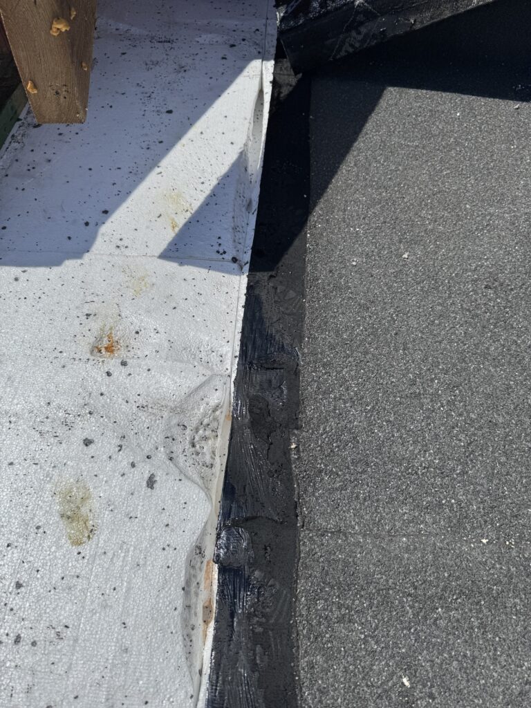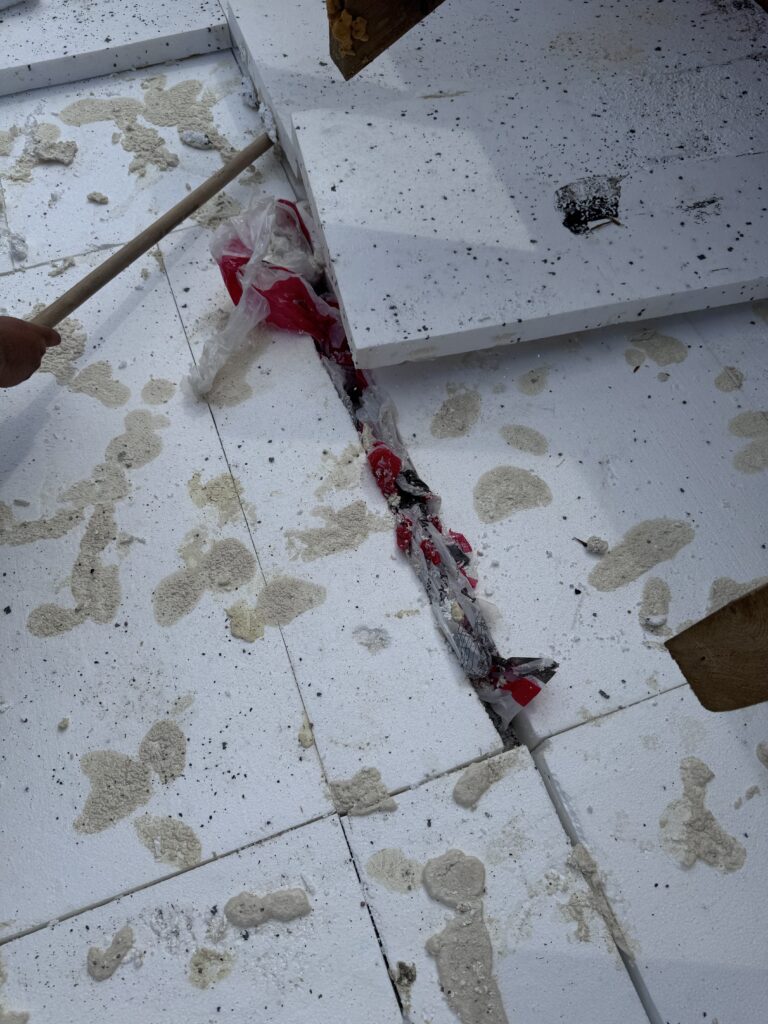 Nasza usługa polegała na demontażu wszystkich warstw, osuszeniu stropu i na nowo złożeniu dachu płaskiego. To właśnie podczas tych prac odkryliśmy liczne błędy w postaci braku styro-papy, wykorzystaniu desek i placów z kleju jako spadków oraz licznych szczelin w termoizolacji gdzie ubytek był wypełniony np. folią po styropianie.