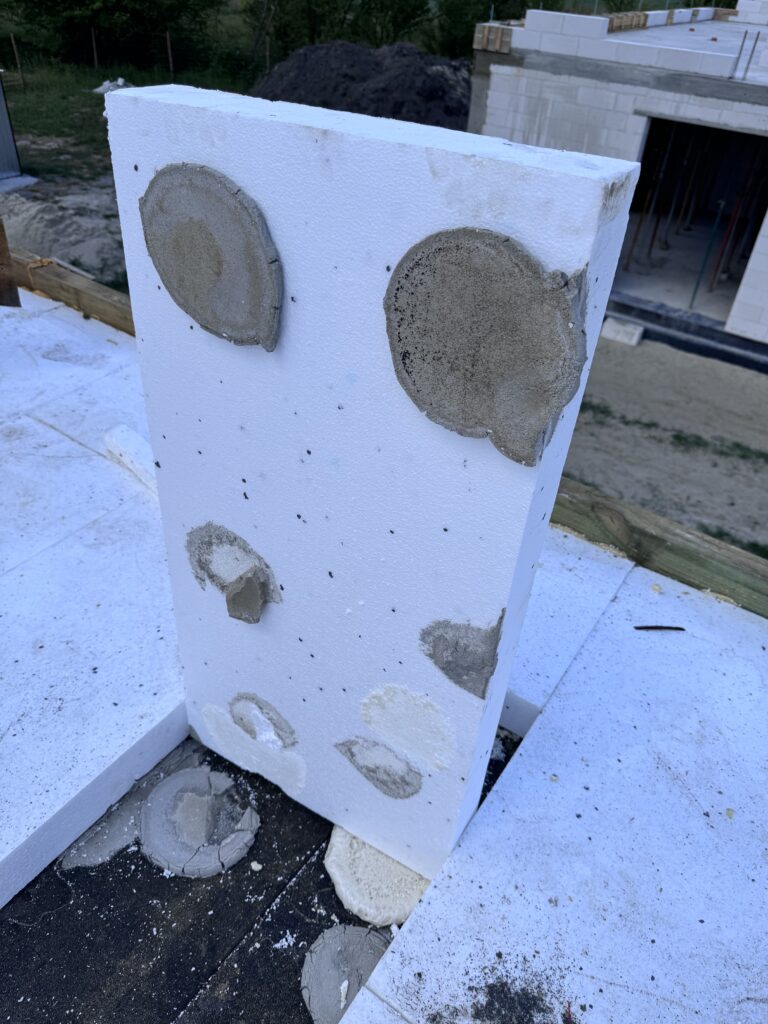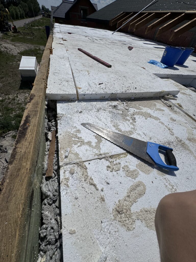 Dach płaski nad garażem w bardzo popularnym projekcie jakim jest Hiacynt od MG Projekt jest średnio trudnym dachem dla osoby znającej temat. Wykonawca najwyraźniej nie był dobrze przygotowany do izolacji i starcia z klientami. Materiały jakie zaproponował to kliny spadkowe które w późniejszym czasie okazały się schodkami z różnej grubości styropianu, dużej ilości kleju do styropianu a nawet desek. Podpunkty z umowy jakie się zgadzały to papa jako paraizolacja która przeciekała, ocieplenie stropu styropianem 15cm EPS100,