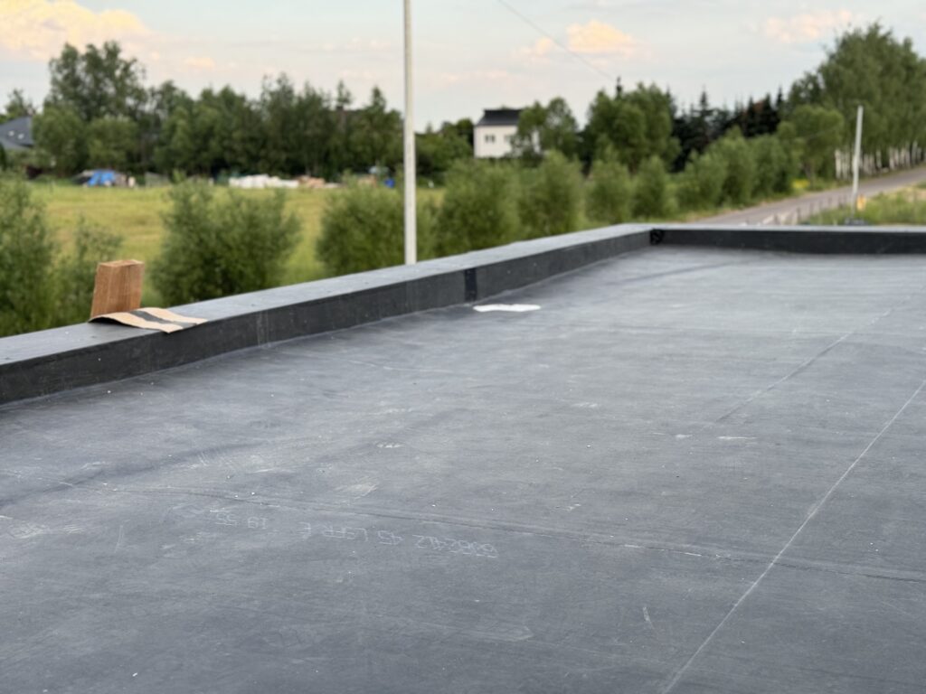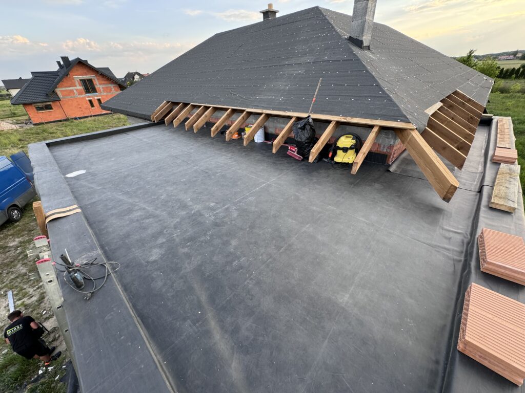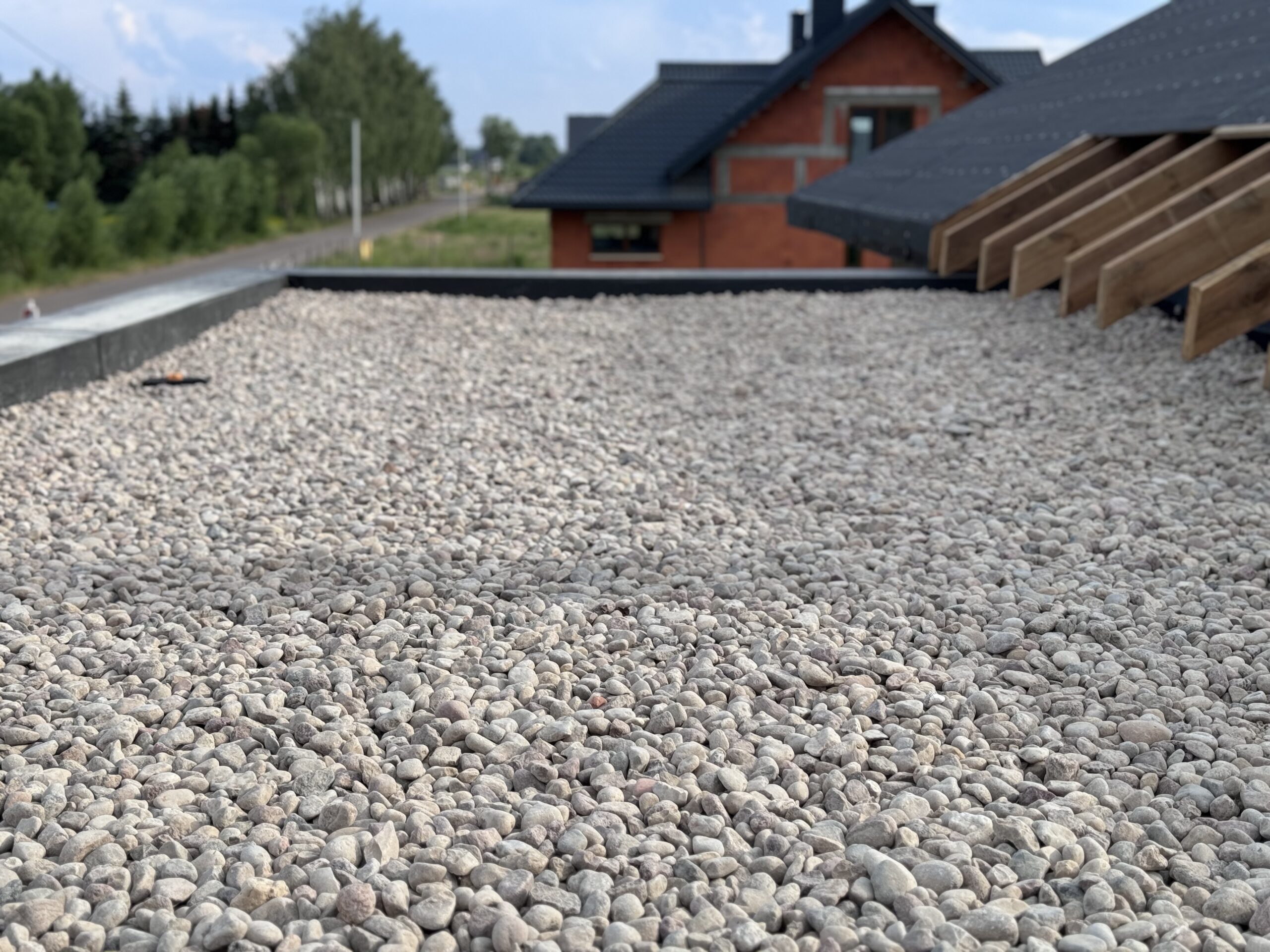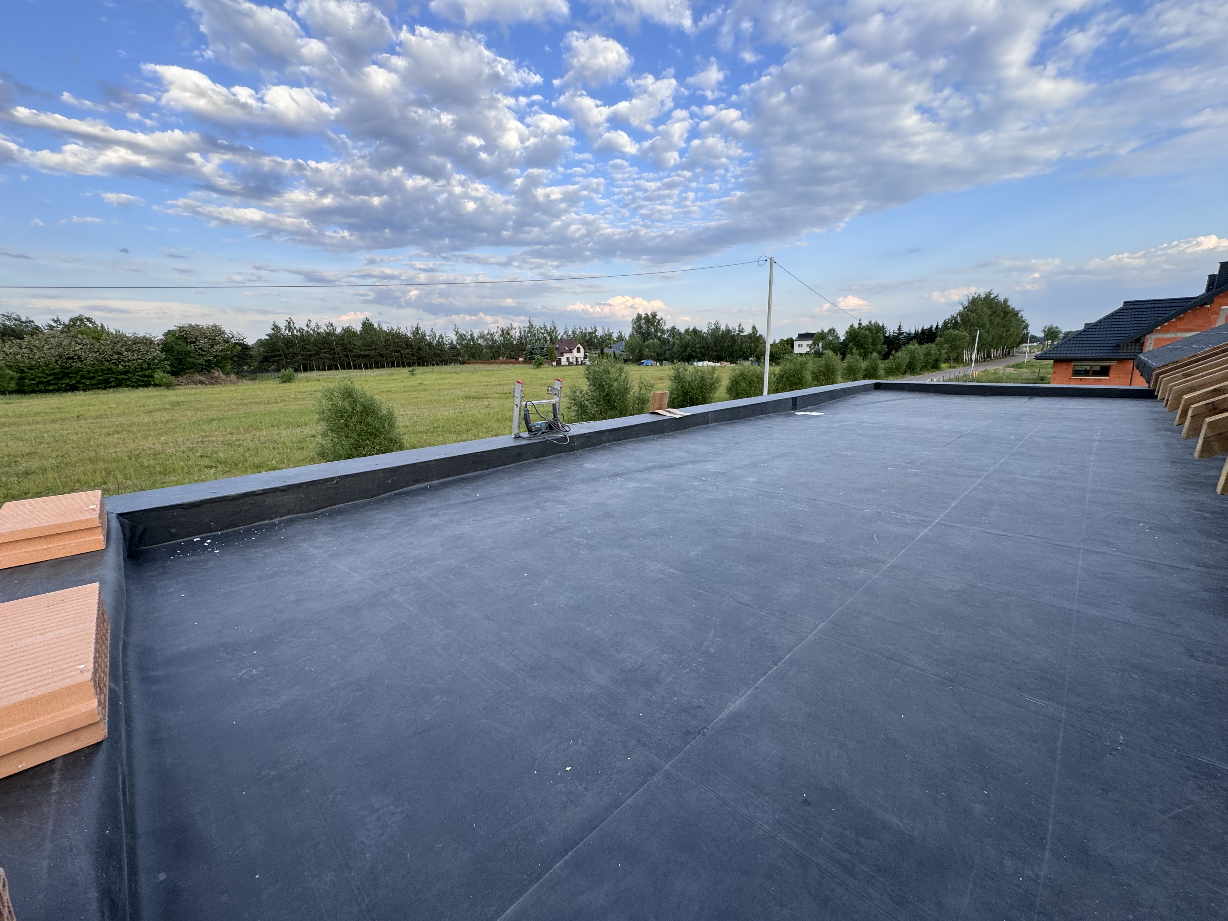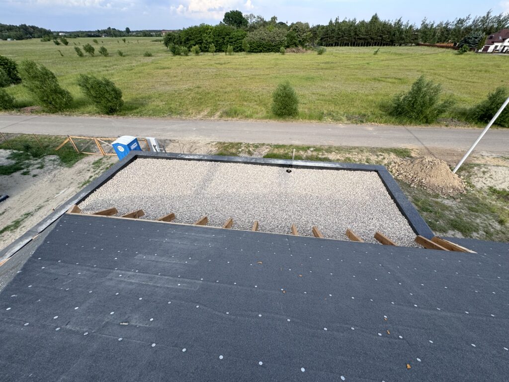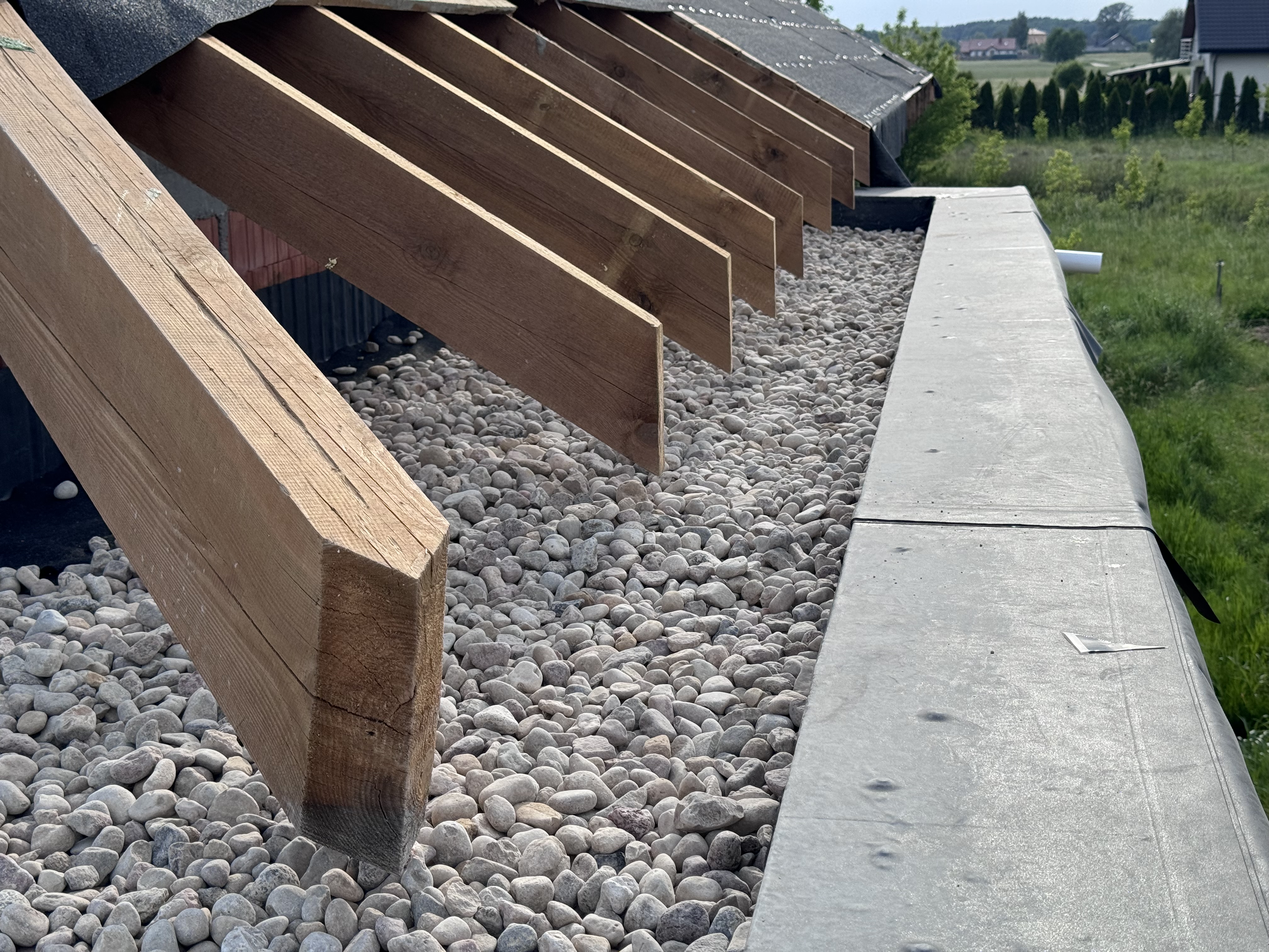 Nowy dach został zaizolowany gumą EPDM Firestone, zostały podniesiona i ocieplona attyka płytą term PIR 5cm oraz wykonaliśmy spadek na płycie OSB do środka aby uniknąć zacieków na elewacji. Całość została przykryta kamieniem i tak nowy dach posłuży klientce na wiele lat.