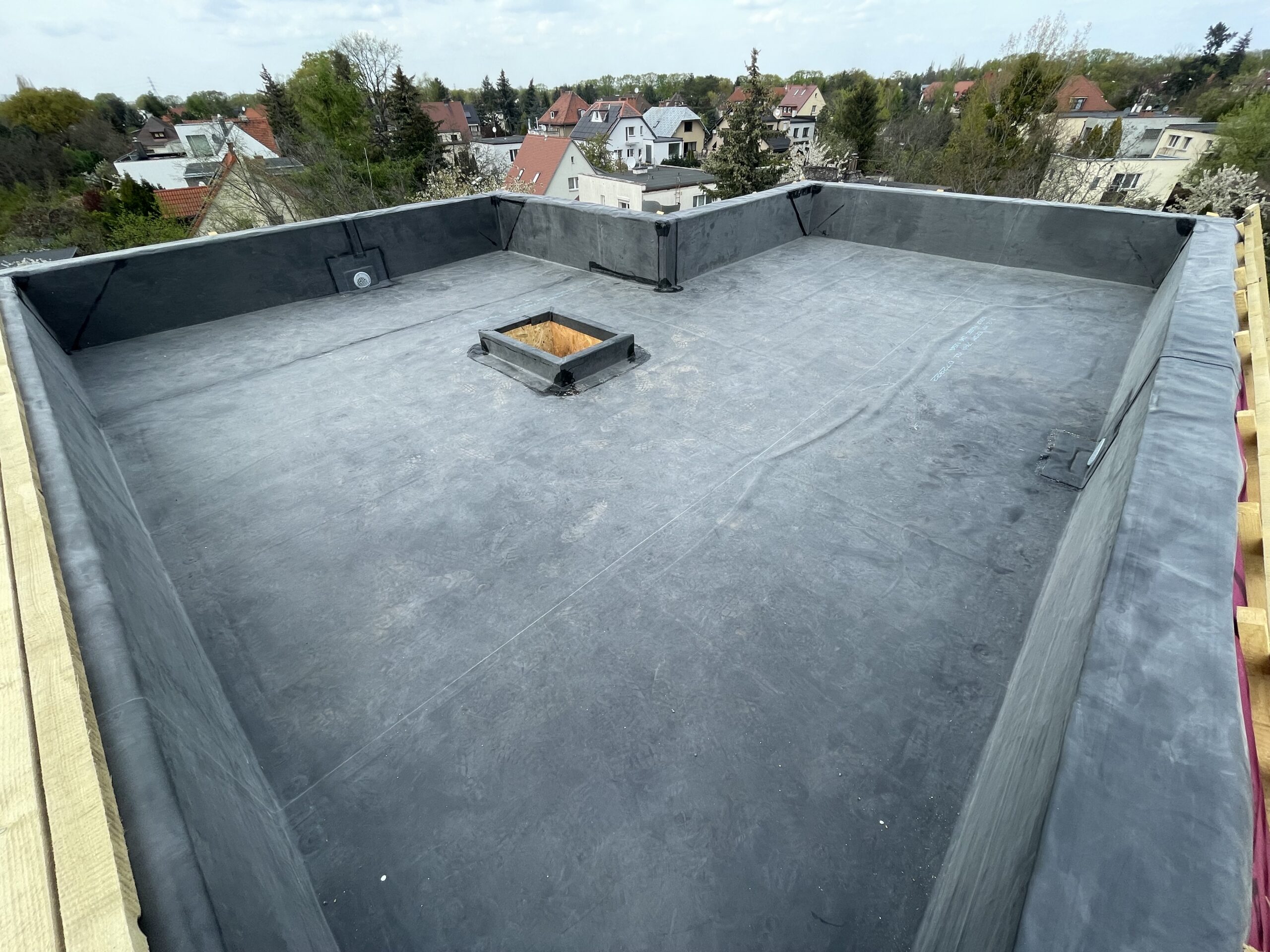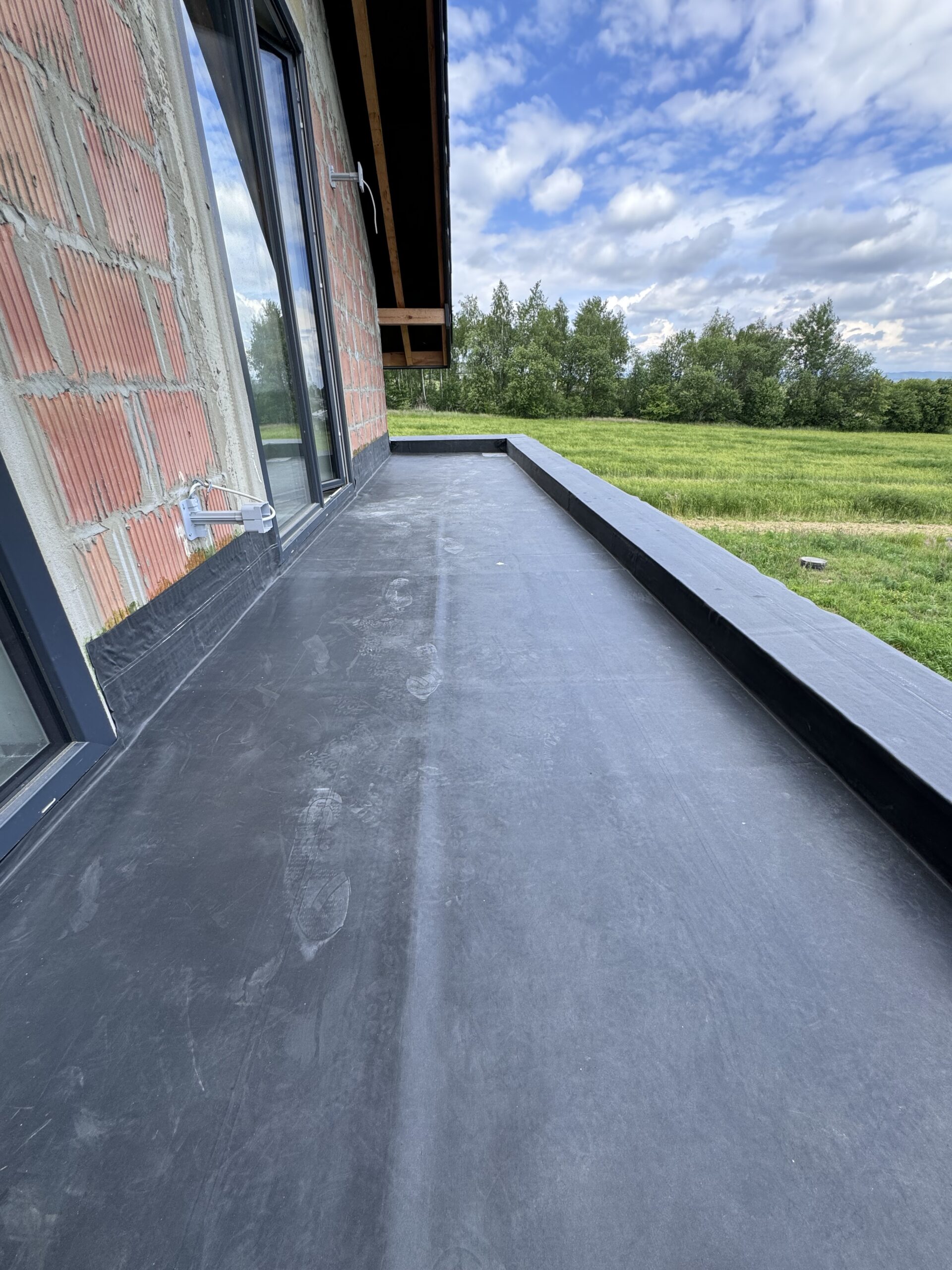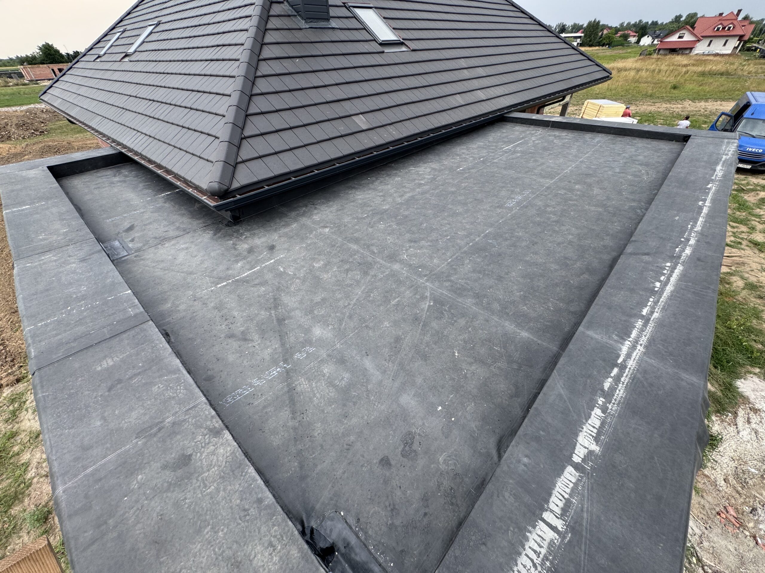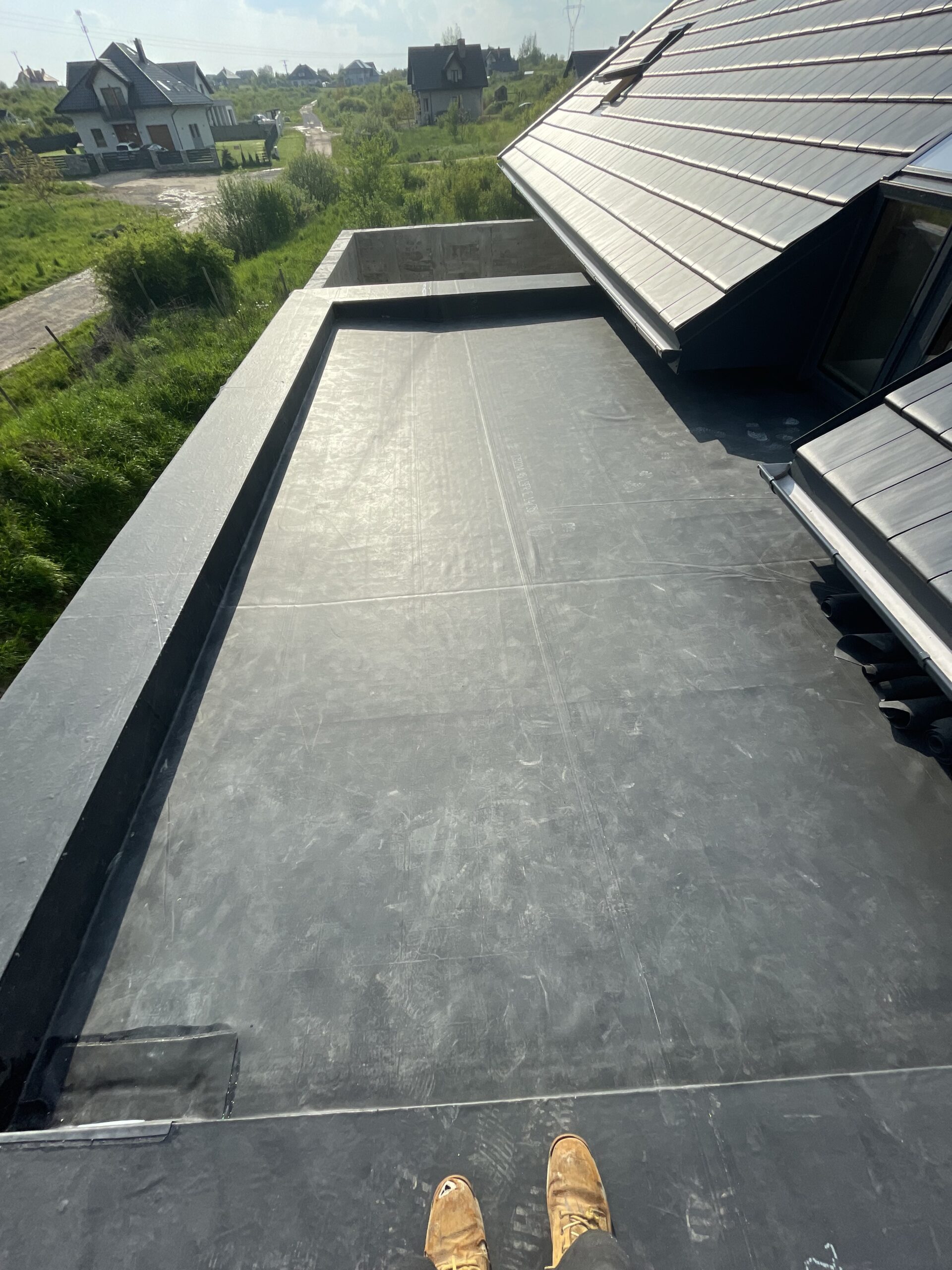 dach płaski wykonywany w środku wakacji gdzie temperatura była odczuwalna cały czas, dzięki temu guma EPDM dobrze dopasowała się do podłoża i powstał jeden z najładniejszych dachów płaskich.