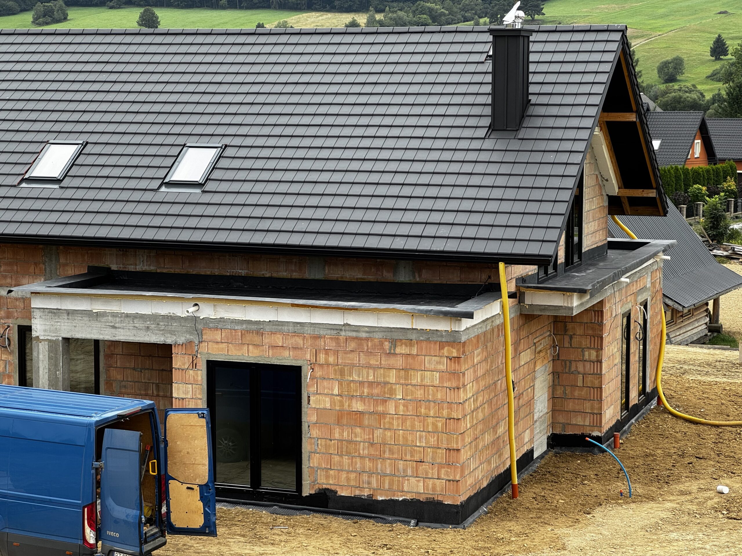Dach mansardowy mieliśmy przyjemność wykonać tylko raz, bryła budynku została dopasowana do otoczenia i mimo wyglądu jest to nowoczesny budynek z ogrzewaniem ścian, tynkami z gliny.